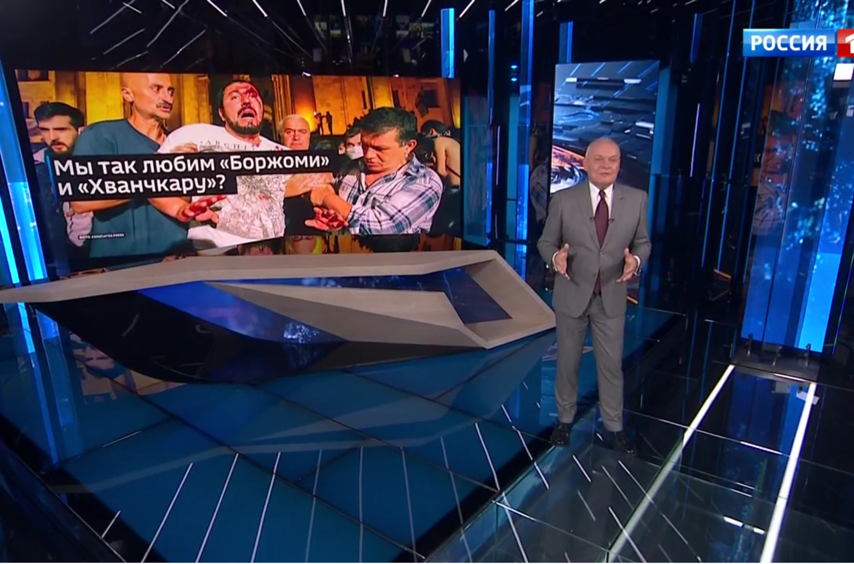 На долю Дмитрия Киселева выпала непростая задача: после вышедшего в «Вестях недели» чуть больше месяца назад вполне благожелательного сюжета о торговых отношениях России и Грузии как-то оправдать резкий поворот в политике России по отношению к этой стране. Рецепт был найден простой: во всех проблемах в отношениях двух стран винить с одной стороны американцев, с другой — бывшего президента Грузии Михаила Саакашвили. Получилось вот как: