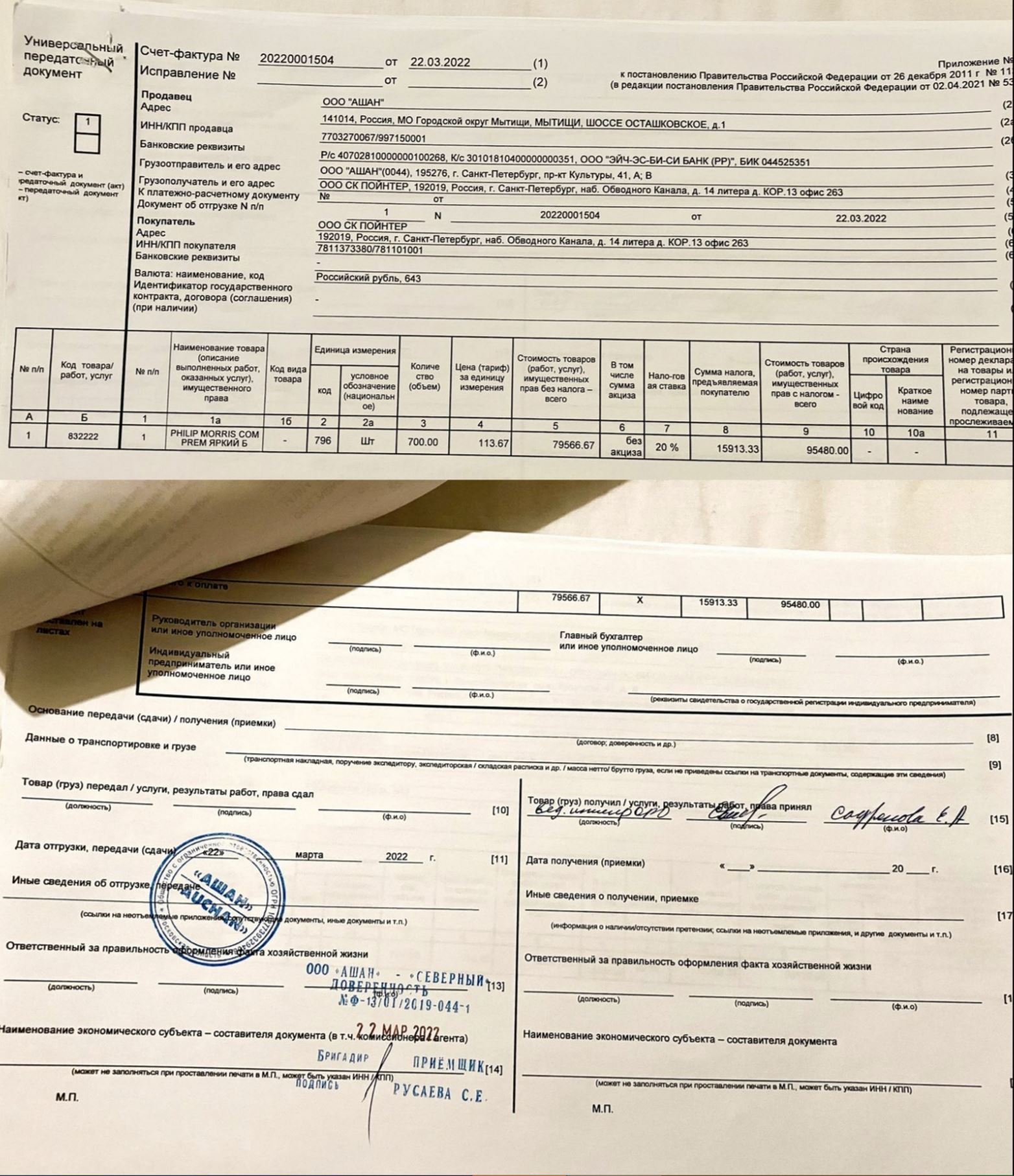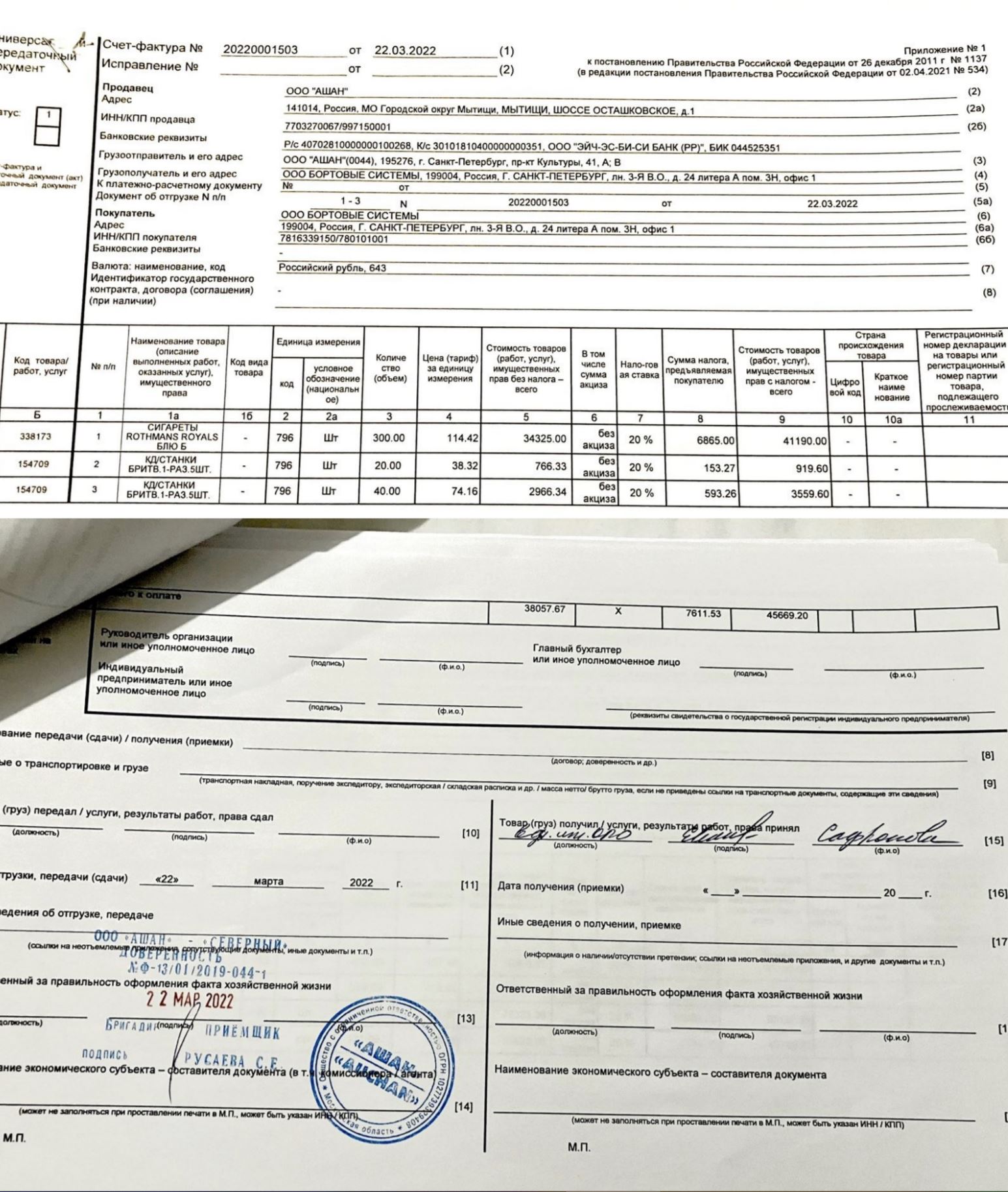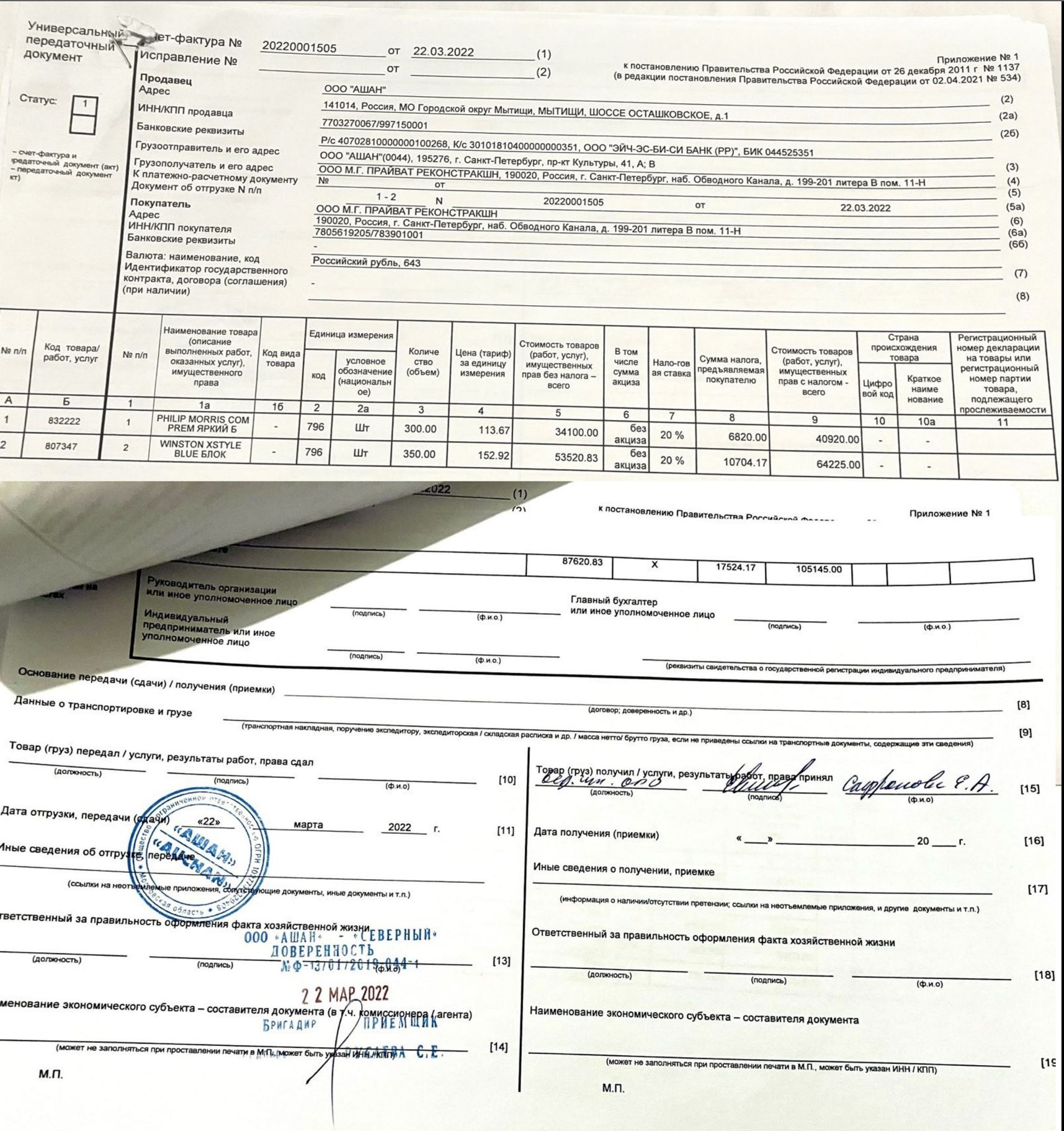 On the morning of March 22, 2022, a third-party carrier arrived at Auchan Severny to pick up the four pallets of “humanitarian aid,” including toothpaste. One person, “leading engineer Safronova E.A.,” signed for all 10 legal entities.
