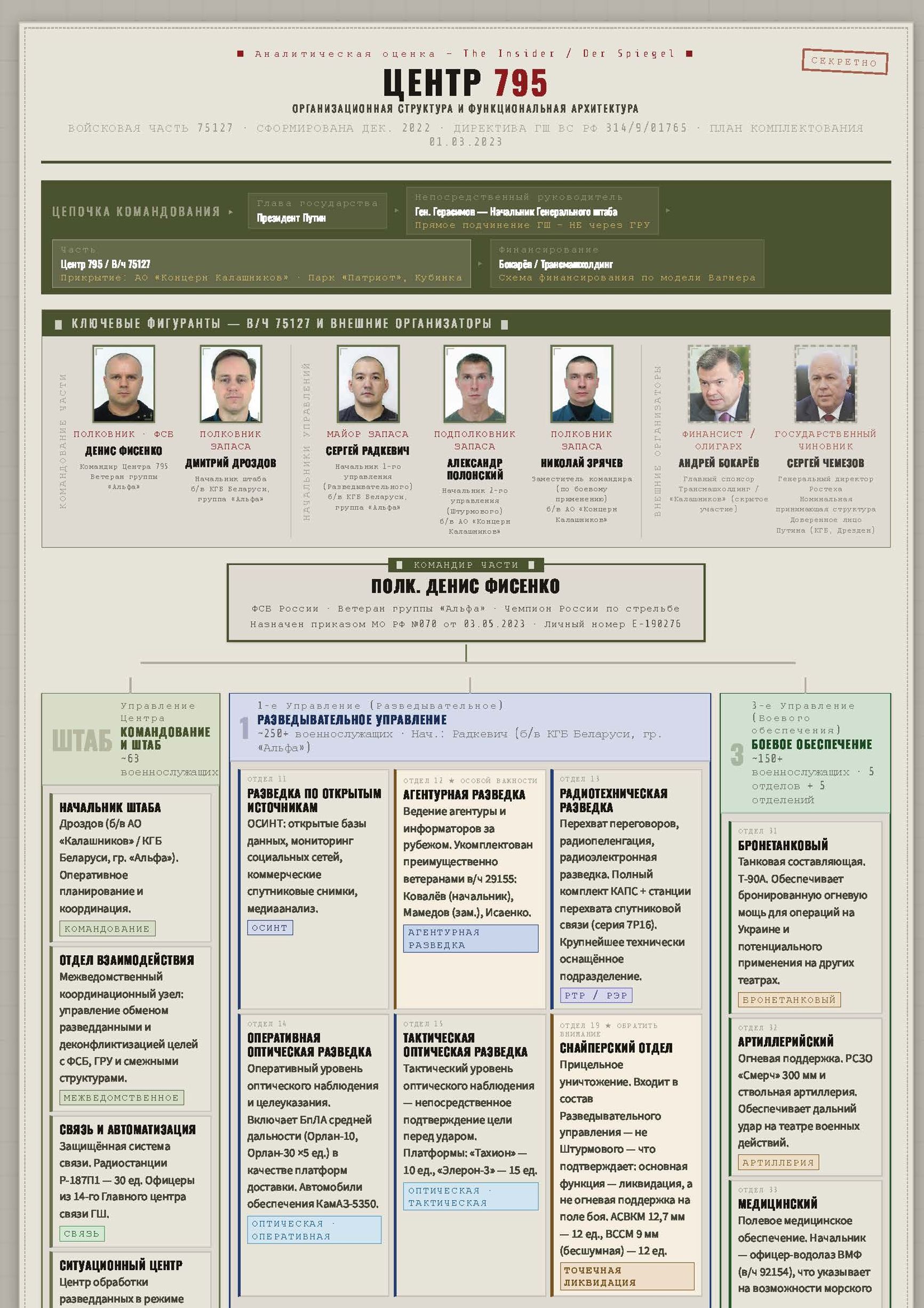 Появившийся уже в ходе полномасштабной войны Центр 795, включающий в себя элитные силы ГРУ и ФСБ, создавался как сверхсекретная и полностью автономная структура, предназначенная для наиболее важных операций, начиная от военных операций в Украине, заканчивая политическими убийствами и похищениями за рубежом. The Insider удалось идентифицировать всех ключевых руководителей и спонсоров этого центра, установить его дислокацию и основные направления его деятельности. Один из его офицеров уже арестован в Колумбии по обвинению в организации похищения нескольких противников Путина. Он провалился, потому что использовал Google Translate.