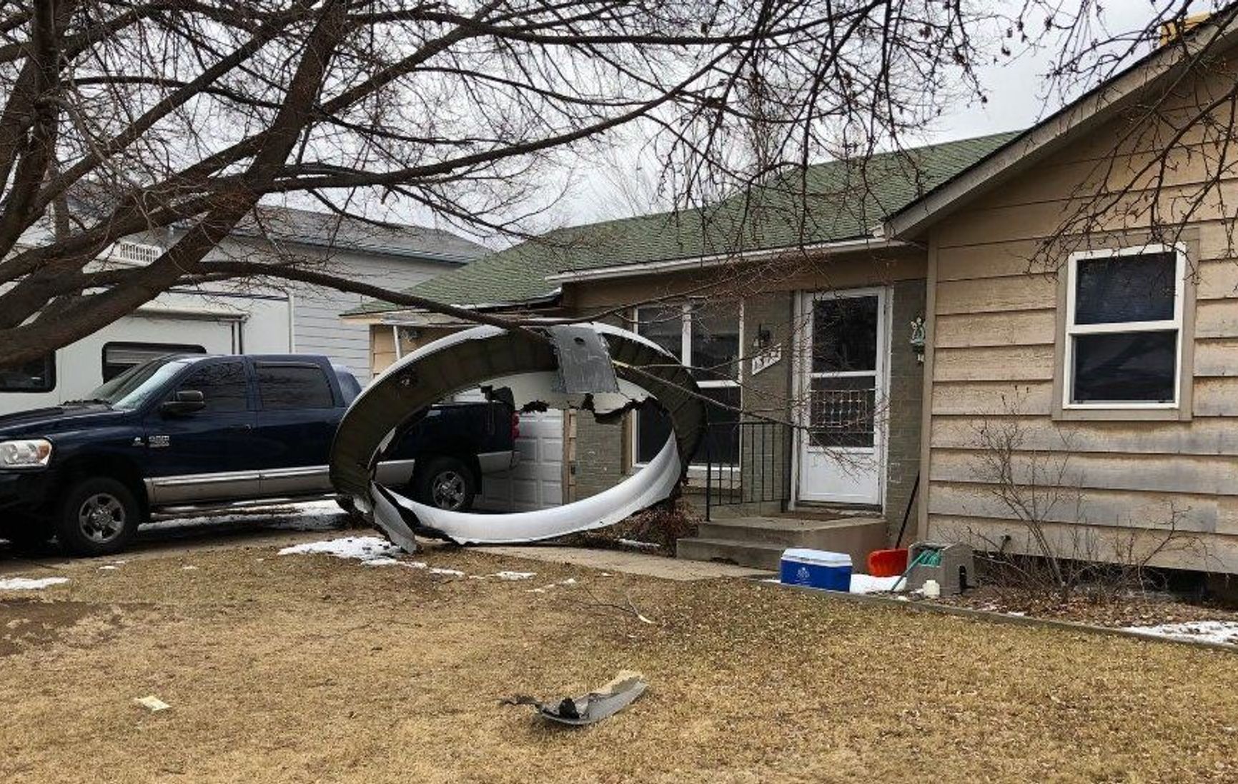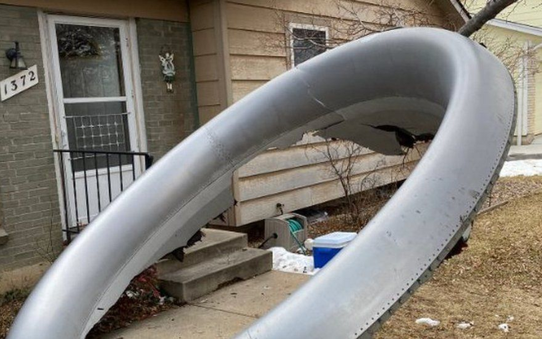 Полиция города Брумфилд опубликовала фотографии части двигателя, лежащей на лужайке перед жилым домом в одном из районов.