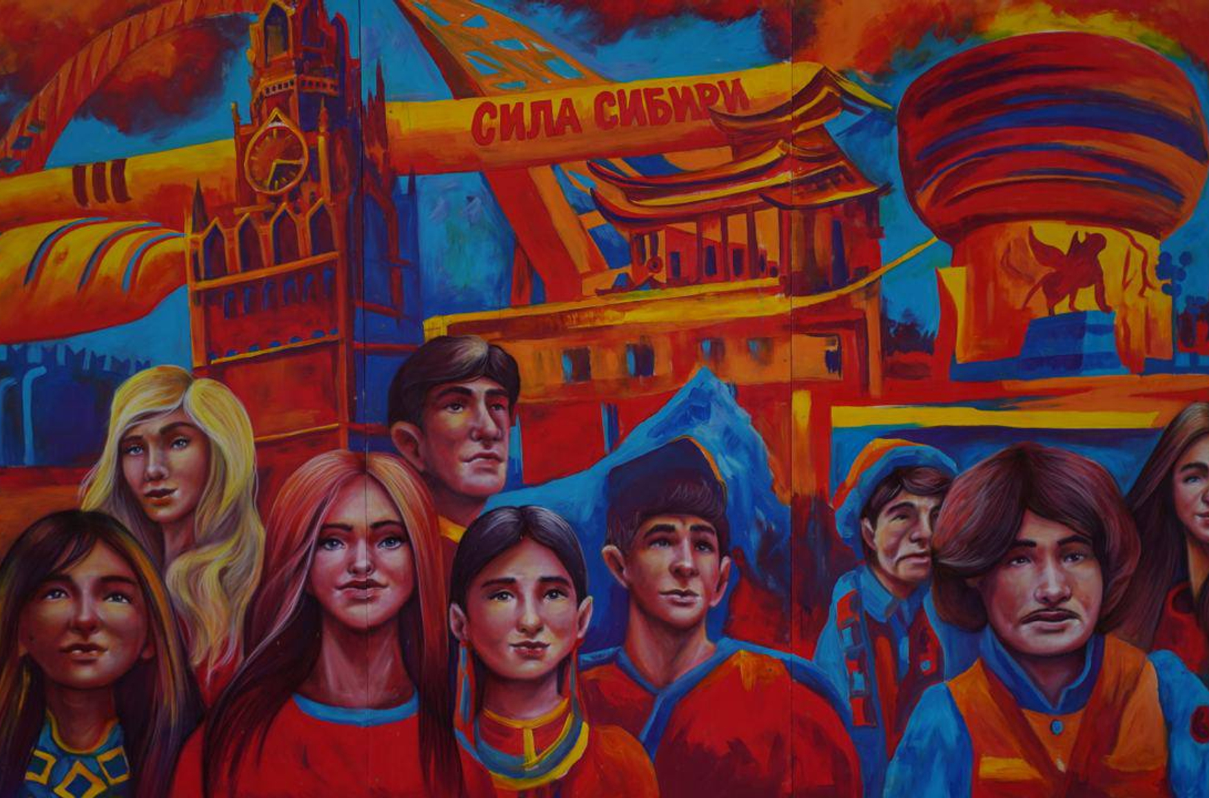 В подписи утверждается, что 20-метровая картина посвящена Дню народного единства и воплощает в себе «сплоченность народов, мощь достопримечательностей и достижений России». Помимо прочего, анонимные авторы изобразили газопровод «Сила Сибири».