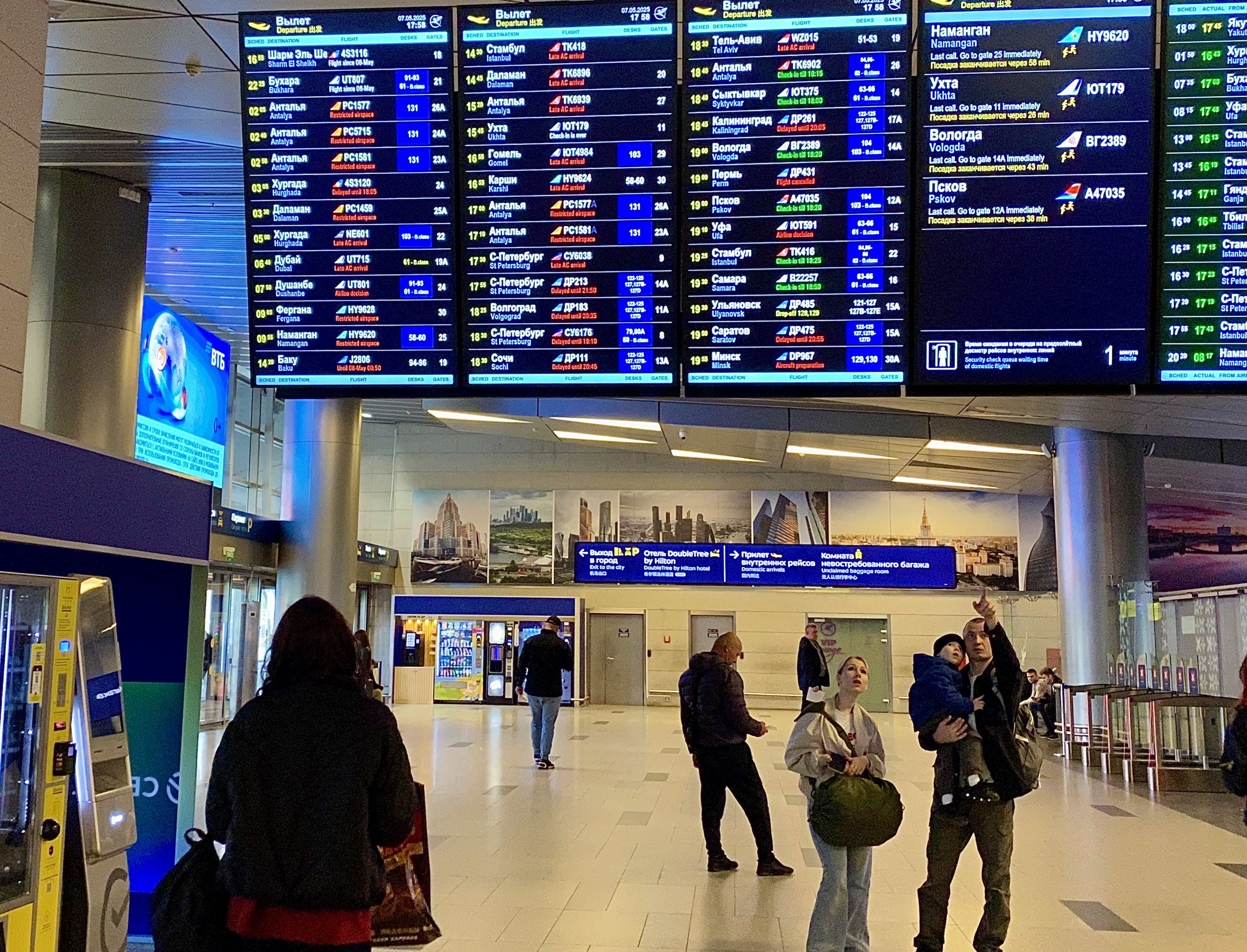 Пассажиры у табло в зале вылетов аэропорта Внуково, 7 мая