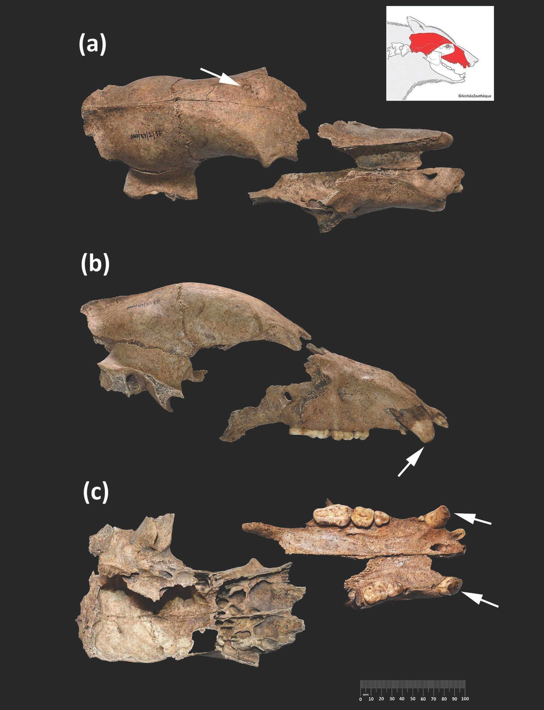 Анализ фрагментированного черепа показал историю жестокого обращения с животным. Шестилетний самец медведя, умерший около 1700 лет назад, получил серьезный перелом лобной кости от удара тупым предметом, вероятно, оружием вроде копья. Рентгеновские снимки и компьютерная томография показали, что травма начала заживать, но осложнилась инфекцией, что привело к остеомиелиту. Челюсти животного также показывали признаки инфекции.