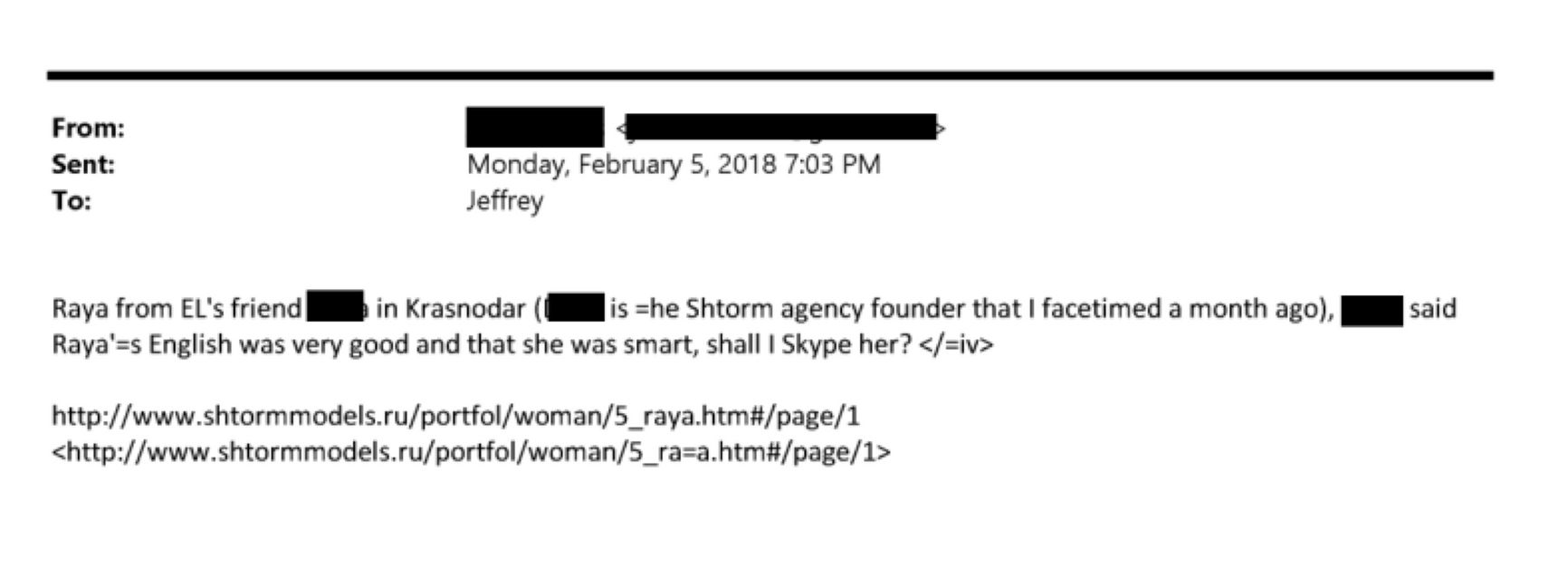 Среди документов, опубликованных Минюстом США в числе так называемых «файлов Эпштейна», оказалось письмо с упоминанием российского модельного агентства Shtorm из Краснодара. В письме, поступившем на почту Джеффри Эпштейна от неизвестного отправителя 5 февраля 2018 года, упоминается агентство и некая девушка по имени Рая.