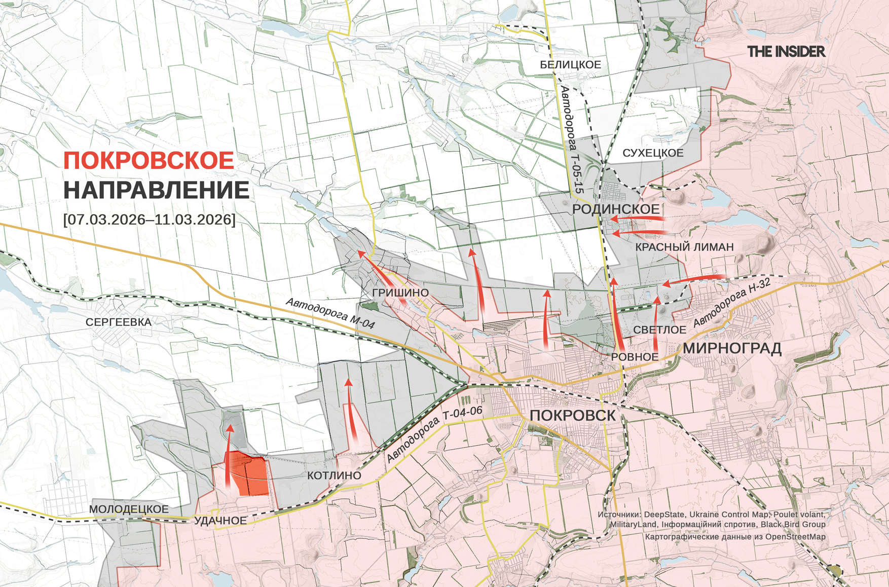 Пророссийский OSINT-ресурс «Сливочный каприз» установил место съемки украинского видео с поражением одиночного российского пехотинца FPV-дроном и сделал вывод о продвижении ВС РФ на 3 км к северу от Удачного западнее Покровска в направлении границы Днепропетровской области. О расширении российской зоны контроля в районе Удачного сообщили и в DeepState, однако на карте проекта она увеличилась всего на 500 метров. Обозначенное российскими «коллегами» место съемки видео украинские аналитики с 6 марта относят к «серой зоне».