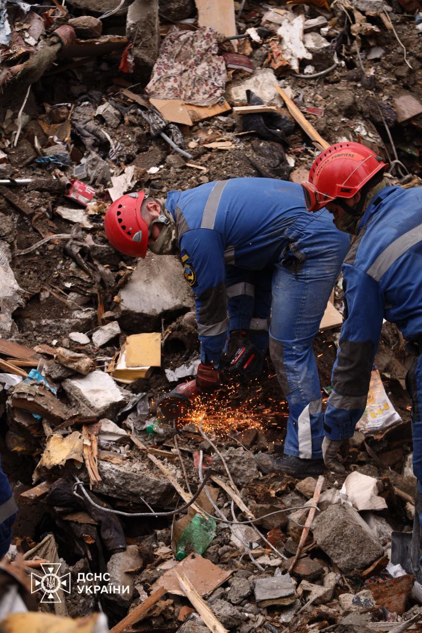 “Kyiv. A missile strike. Direct hit on a residential building. People are trapped under the rubble. All [emergency] services are on site. Russian terrorists.”