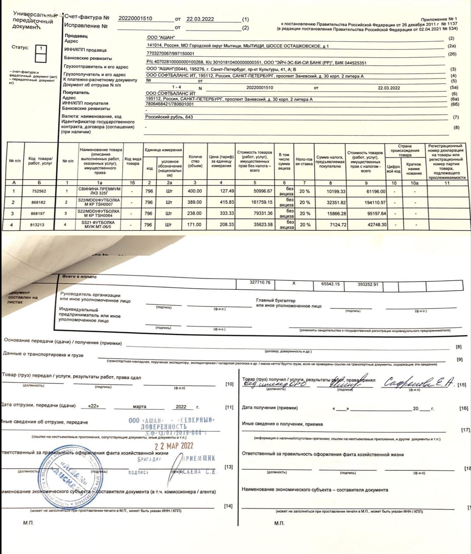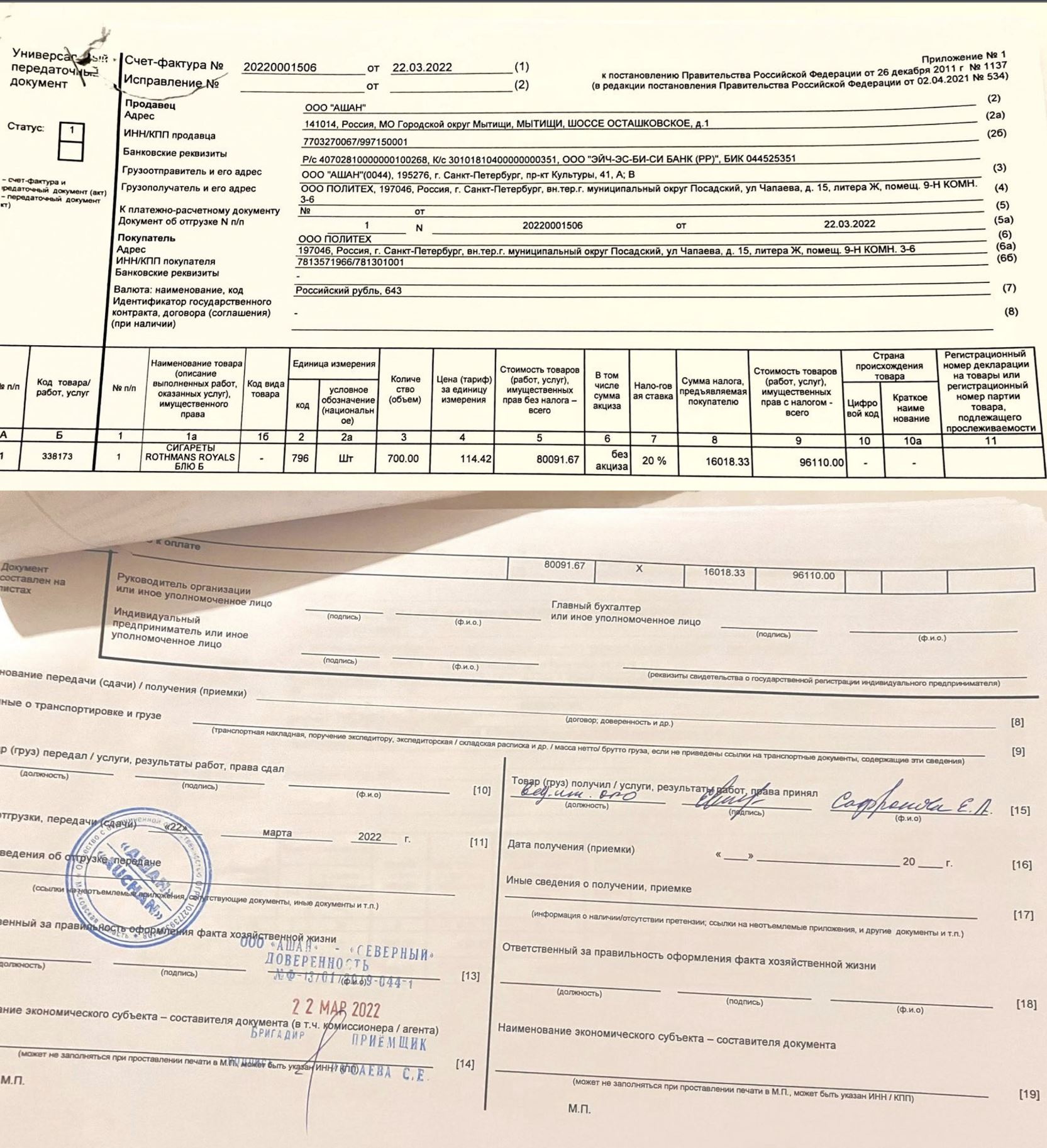 On the morning of March 22, 2022, a third-party carrier arrived at Auchan Severny to pick up the four pallets of “humanitarian aid,” including toothpaste. One person, “leading engineer Safronova E.A.,” signed for all 10 legal entities.