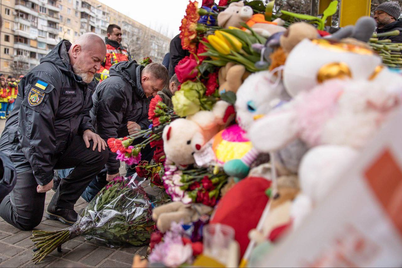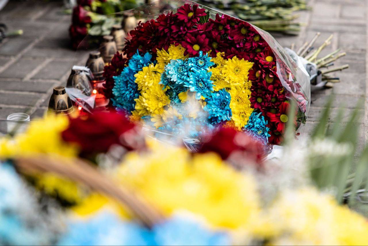 «Цветы в память о невинных жизнях, которые унесли россияне, принесли в разбитый дом вместе со спасателями, полицейскими, волонтерами и главой Днепра».