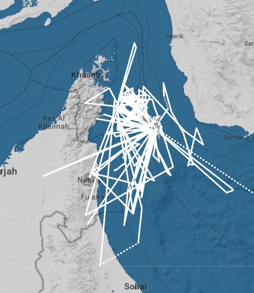 Данные о перемещениях танкера неполны: в районе Ормузского пролива его трек выглядит фрагментарным и хаотичным.